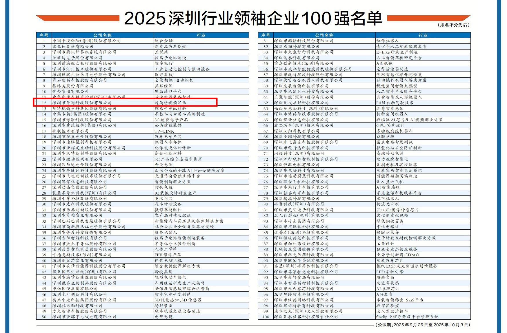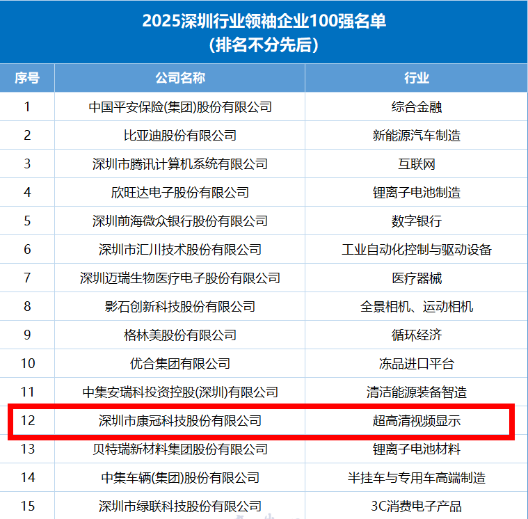 近日,由深圳市工商业联合会(总商会)、深圳报业集团指导,深圳市行业领袖企业发展促进会与深圳商报/读创客户端共同主办的“2025深圳行业领袖企业100强”评选结果出炉。康冠科技成功入选该榜单,彰显了公司在超高清视频显示领域的强劲实力,凸显了创新成果所带来的行业引领效应。